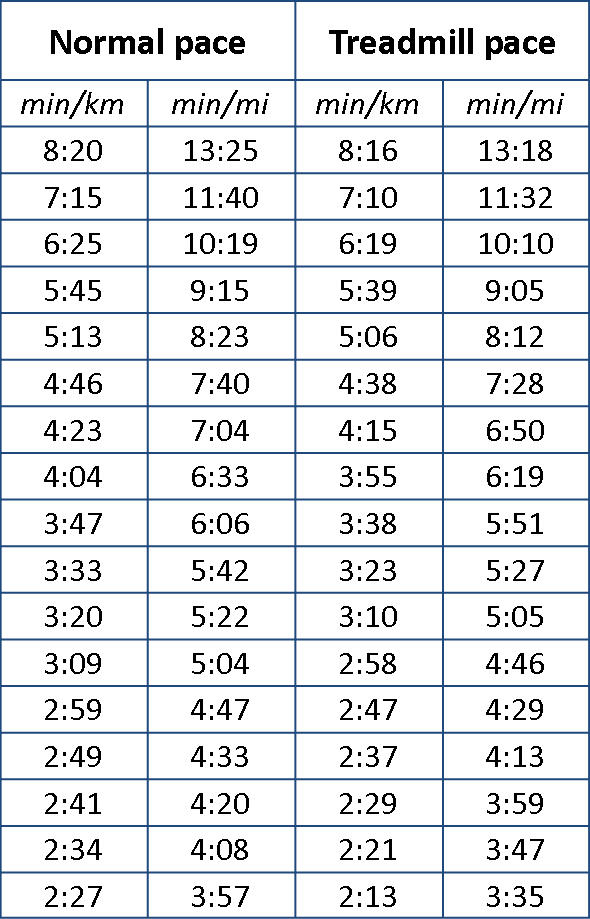 A mile is the same distance whether run on a treadmill or the road. A mile is longer than a kilometer and is equivalent to approximately 1.609 kilometers. After running for 10 minutes, just enter 1000 . Yes, 1.00 means one mile. If you've run five miles on a treadmill, that's the same distance as having run it on a road . Just as people walk and run at different speeds, they also cycle at different speeds. If you're going to ride your bike for one mile, how long will the trip take? For people who do not have a computer screen with a track display, then . Below is a chart that you can use to get approximate equivalent efforts between. Went on a tredmil yesterday. Treadmill mph setting, pace per mile, equivalent paces by incline. Running on a treadmill for a mile is easy because you clearly . Treadmill speed (miles per hour).